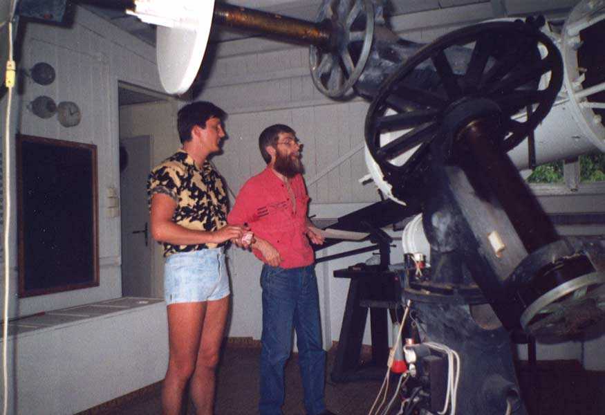 Juni 1990 in Falkensee-Finkenkrug. Hier haben wir unseren Spiegel abgeholt. Michael Greßmann zeigt uns seinen 450 mm Cassegrain. Wie unschwer zu erkennen ist, ein gewaltiger Anblick...