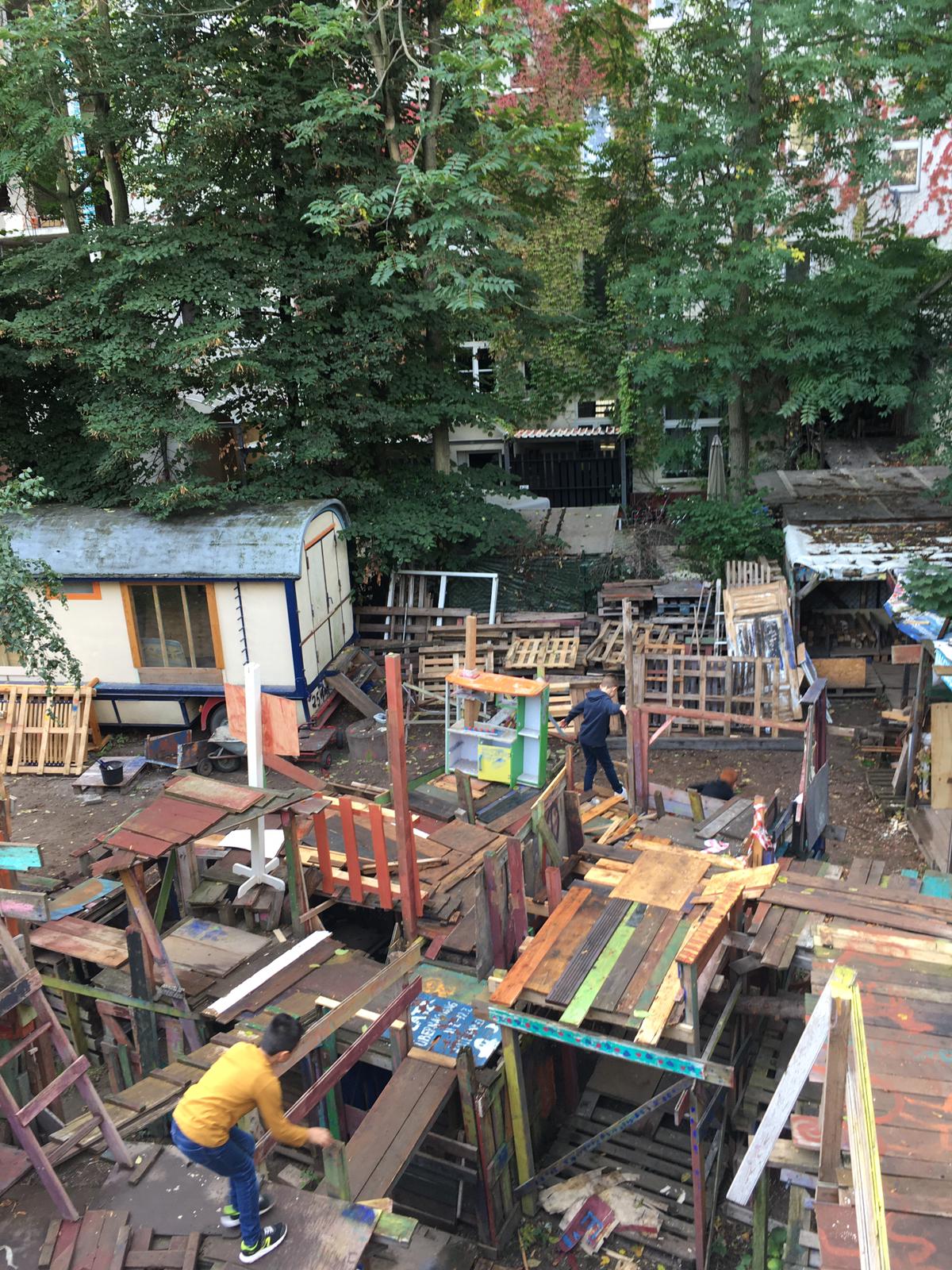 Als wir 9 Uhr endlich da sind, warten schon zwei sympathische Handwerker auf uns, kurze Einweisung, Vorstellungsrunde, Ausleihsystem kennenlernen und verstehen. Dann geht’s los, die wilde Holzlandschaft in mehreren Etagen wird erobert. Es gibt Geheimverstecken, Schauekeln, Rutschen und vieles mehr.