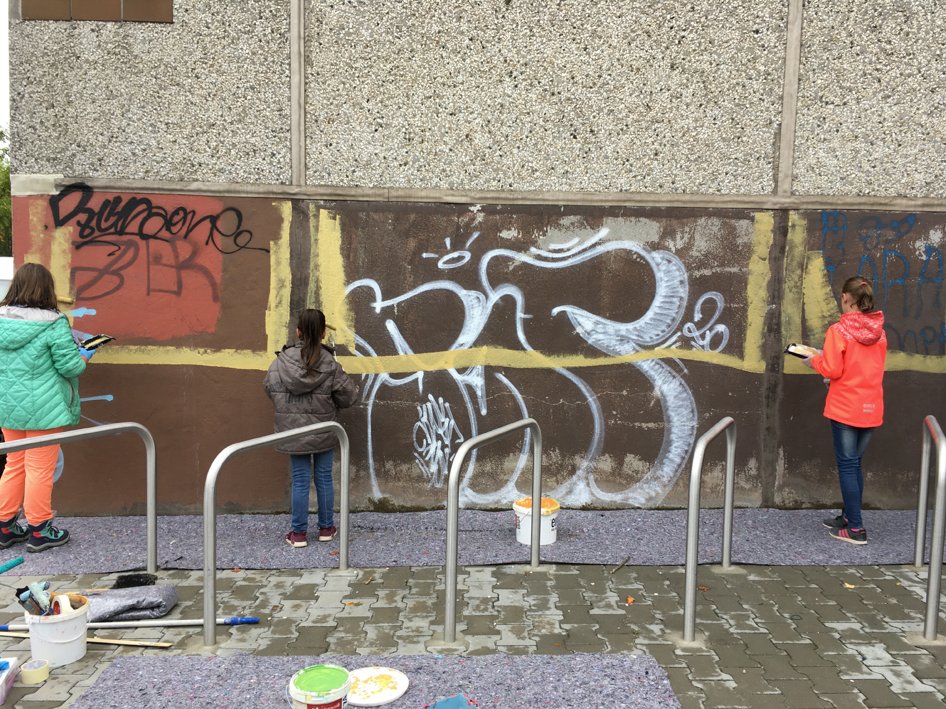 Dieses Mal hatten wir ein privates Publikum, Leute die ihr Auto vor der Schule parkten, Erwachsene die Kinder abholen wollten, Besucher*innen vom Ärztehaus/Apotheke oder Spaziergänger*innen. Kinder erzählten es im Stadtteil weiter und am zweiten Tag waren wieder Menschen Vor Ort um zu sehen wie das Bild Stück für Stück fertig gestellt wird.