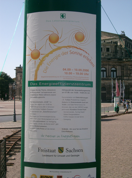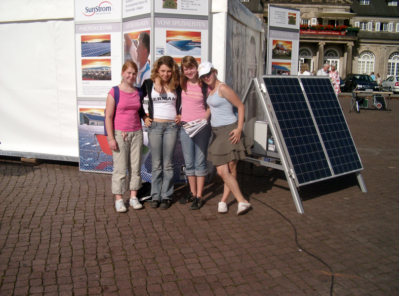 Am Donnerstag, dem 07.09.2006, hat sich eine kleine Gruppe von Schülern der 9.Klassen unserer Schule auf dem Theaterplatz getroffen, um sich eine Ausstellung über "Erneuerbare Energien", speziell Solarenergie, anzusehen. Solarenergie hat ja etwas mit der Sonne zu tun und wir waren froh, dass wir einen tollen Sonnentag erwischt hatten.