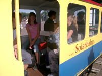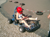 Als erste Attraktion fuhren wir alle mit einer Eisenbahn, die auf ihrem Dach Solarzellen hatte und nur mit Sonnenenergie betrieben wurde. Ein Mitarbeiter der Ausstellung erklärte uns dann den Aufbau einer Solarzelle und wie in ihr Strom erzeugt wird; genau haben wir es noch nicht verstanden. An einer anderen Stelle fuhren Elektro-Carts. Die haben wir natürlich auch ausprobiert und sind einige Runden mit ihnen gefahren. Damit die mit Batterien betriebenen Carts ständig einsatzbereit sind, stand eine Solartankstelle zum Laden bereit.