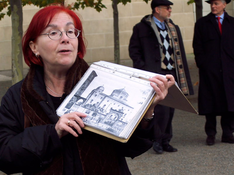 Nach ca. zehn Minuten war es dann endlich so weit. Zuerst erklärte sie uns einiges über das Haus. Wer der Architekt war, wie die Synagoge früher aussah und noch viele andere Dinge. Danach packten alle ihre Schreibsachen aus und los ging es. Wir wurden in eine Art Raum geführt, der keine Decken und Wände hat. Diese wurden durch einen "Umhang" ersetzt, der goldene Ketten besaß. Viele von uns waren darüber sehr erstaunt. Dann setzten wir uns auf die Bänke und warteten gespannt.