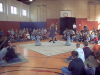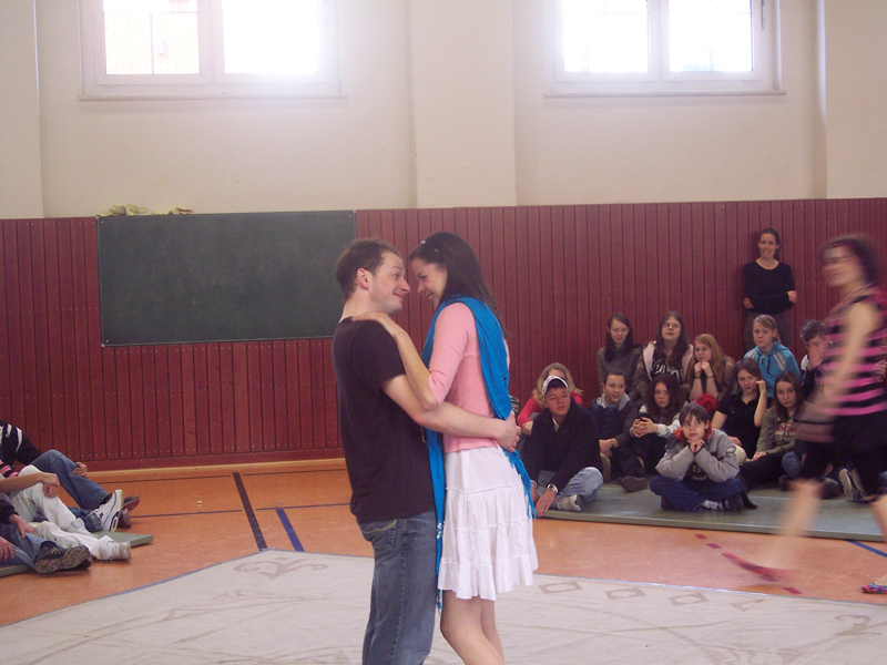 Mit einfachen Requisiten und fantasievollen Kostümen zogen die vier Londoner Darsteller unsere Schüler und Lehrer schnell in ihren Bann. Einige Zuschauer wurden sogar mit in das Spiel mit einbezogen. Ausgelassenes Gelächter wechselte sich mit konzentriertem Zuhören ab. Kräftiger Applaus beendete die beiden gelungenen Aufführungen. Das englische Theater stellte im Hinblick auf die bevorstehenden Englischprüfungen für die Zehntklässler eine Bewährungsprobe dar und für die jüngeren Schüler war es Ansporn und Motivation für weiteres fleißiges Pauken von Vokabeln, Redewendungen, Grammatik usw.
